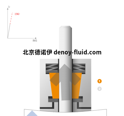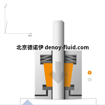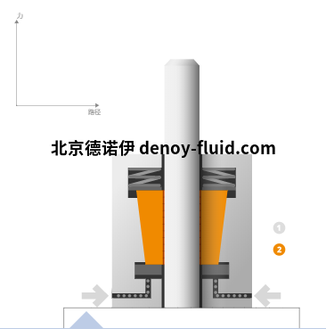 切斷壓力時,碟形彈簧將夾緊套管壓入外殼的錐體中,從而在圓桿和夾緊套管之間產(chǎn)生初始摩擦力(緊貼狀態(tài))。?接近開關(guān)的信號從2變?yōu)?/span>1。