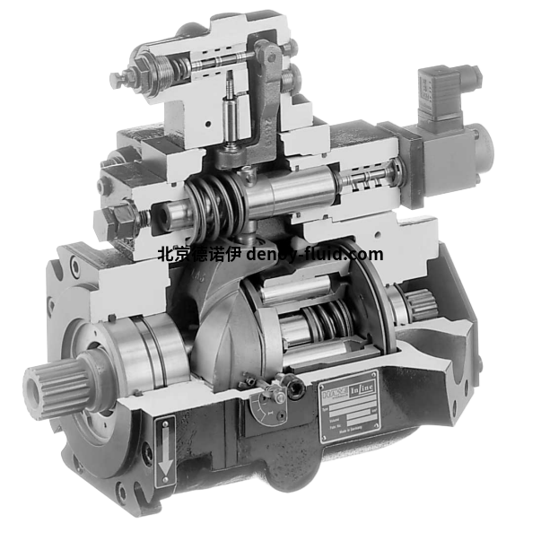 變量軸向柱塞泵調(diào)節(jié)幾何輸送量,調(diào)節(jié)范圍為最大值至零。它以此改變供給消耗器的體積流量。